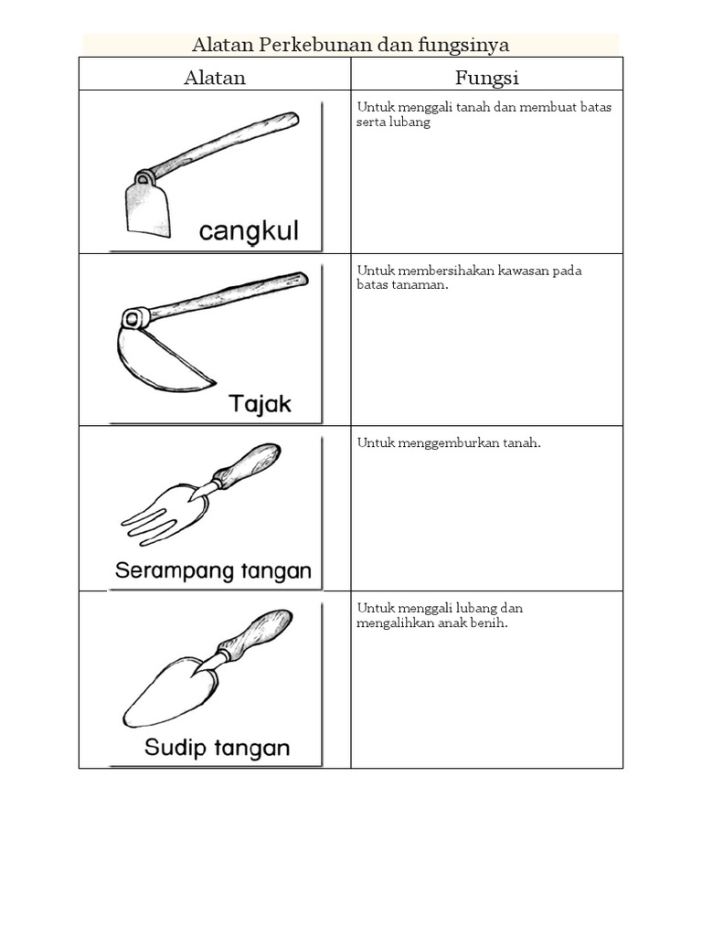 FUNGSI ALATAN PERKEBUNAN Membuka kotak. PRAVOKASIONAL KEBUN MENGENAL ALATAN Immagini ed etichette. Fungsi dan Kegunaan Alatan kebun Trova le corrispondenze.